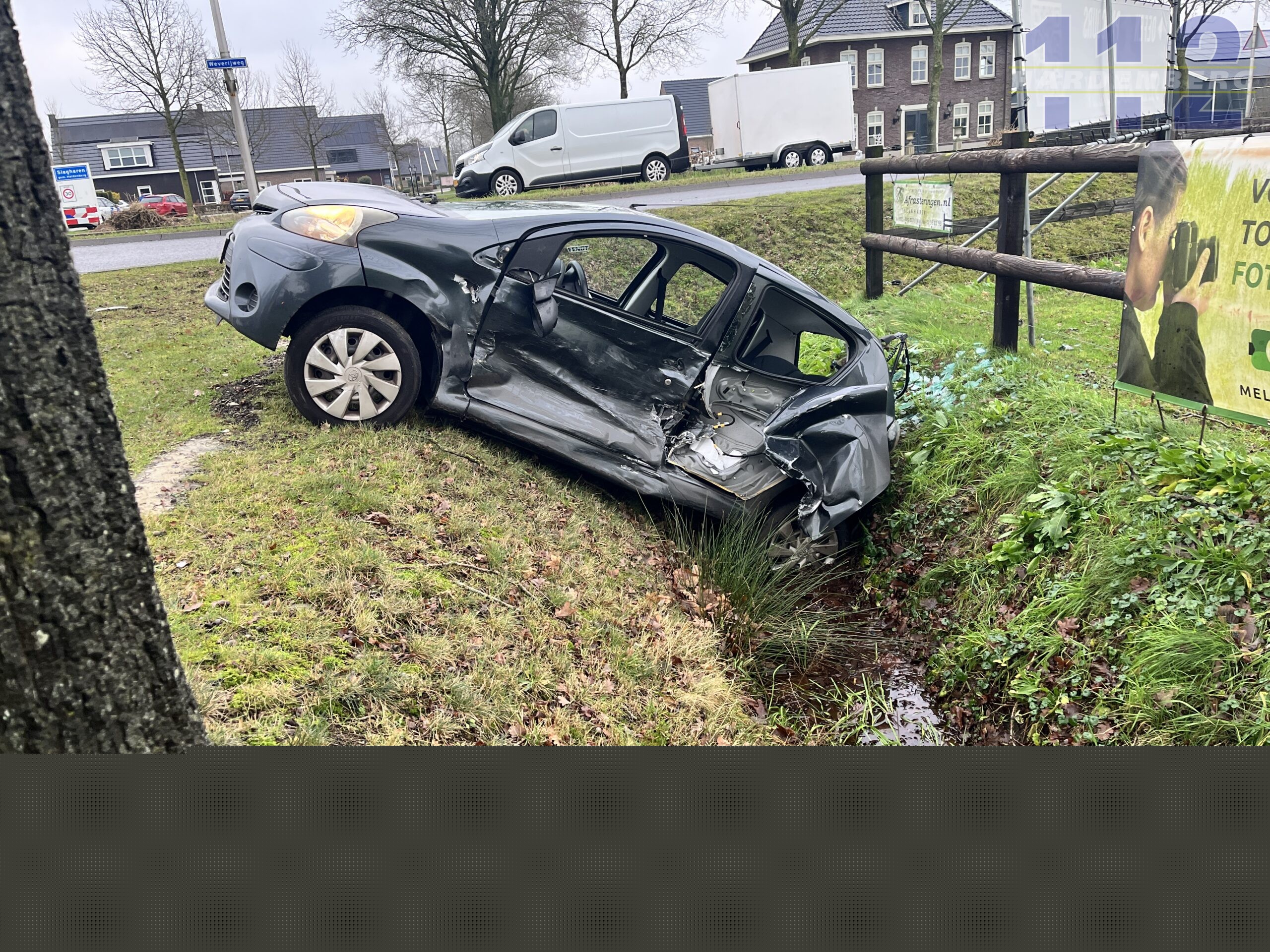 Op de kruising Weverijweg met de Moeshoekweg in Slagharen is maandagmiddag een auto met de achterkant in de sloot terecht gekomen na een aanrijding.