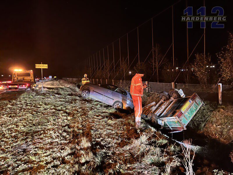 De bestuurder is door onbekende oorzaak van de weg gereden, heeft een verkeersbord geramd en kwam op de kop in de sloot terecht. De bestuurder was niet meer bij het voertuig. Mogelijk dat het ongeval al eerder is gebeurt. Een berger zal de auto uit de sloot moeten halen.