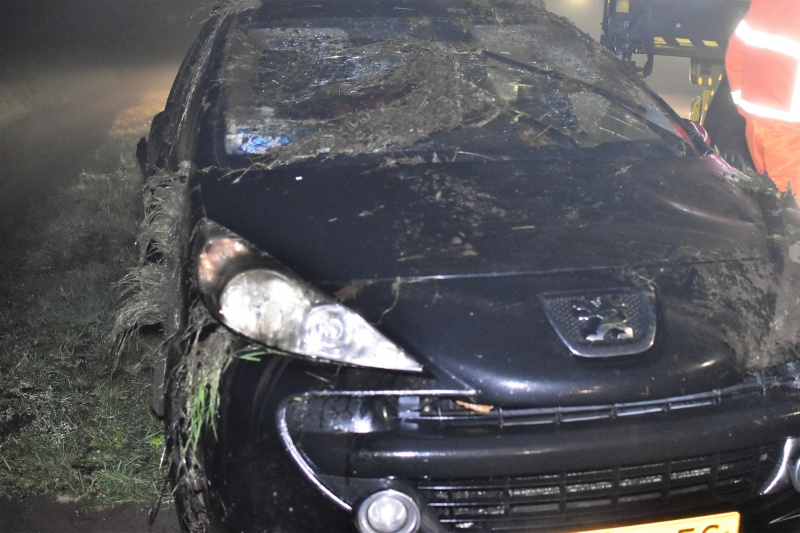 Slagharen – Een auto is vrijdagavond van de weg geraakt en op de kop in de sloot beland  op de Witmansweg. Niemand van de vier inzittenden raakte bij het ongeluk gewond. De auto miste de bocht en gleed de sloot in. Waarschijnlijk heeft de mist een rol gespeeld bij het ongeluk.