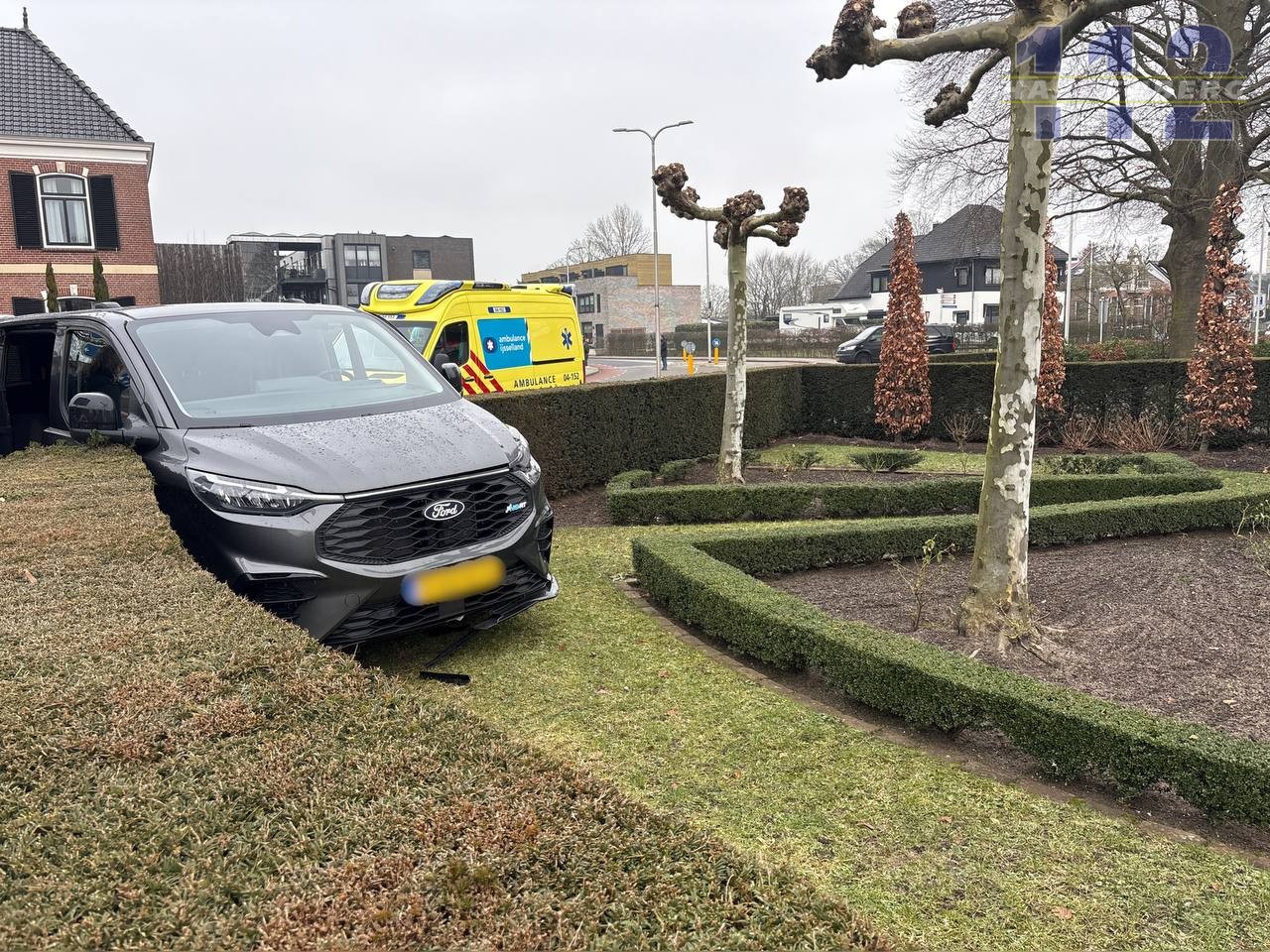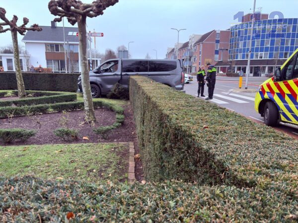 Op de Stationsstraat in Hardenberg is zondagmiddag een bestelbus in een tuin van een woning terecht gekomen.