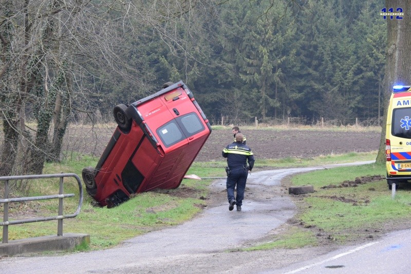 Mariënberg – Op de Beerzerweg in is vanochtend een busje op de kop in de sloot terecht gekomen. Door de regen en gladheid is het busje vermoedelijk gaan schuiven en van de weg geraakt.