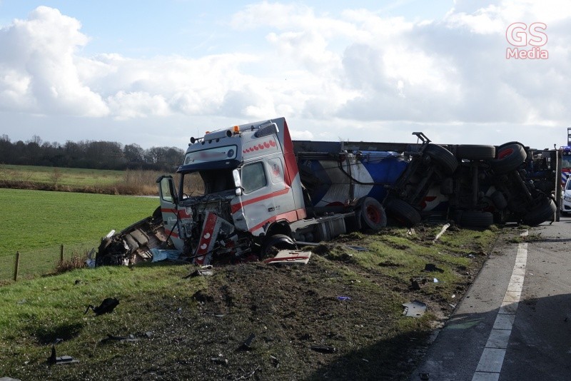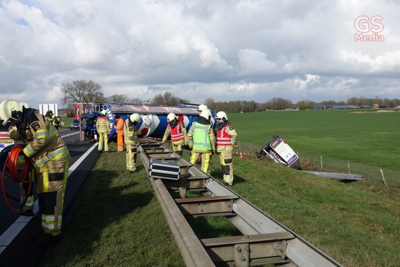 Diffelen – Door een botsing tussen een bestelbus, een vrachtwagen en een ander nog onbekend voertuig is de N36 tussen Beerze en Witte Paal afgesloten. De bestelbus kwam op de kop in de sloot terecht. De vrachtwagen belandde in de berm.