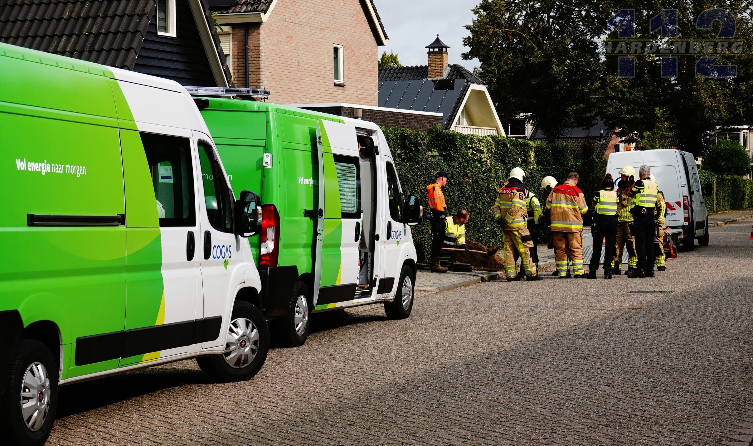 De brandweer is ter plaatse. De politie heeft een deel van de straat afgezet. Inmiddels is ook Cogas ter plaatse om het lek te dichten.