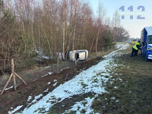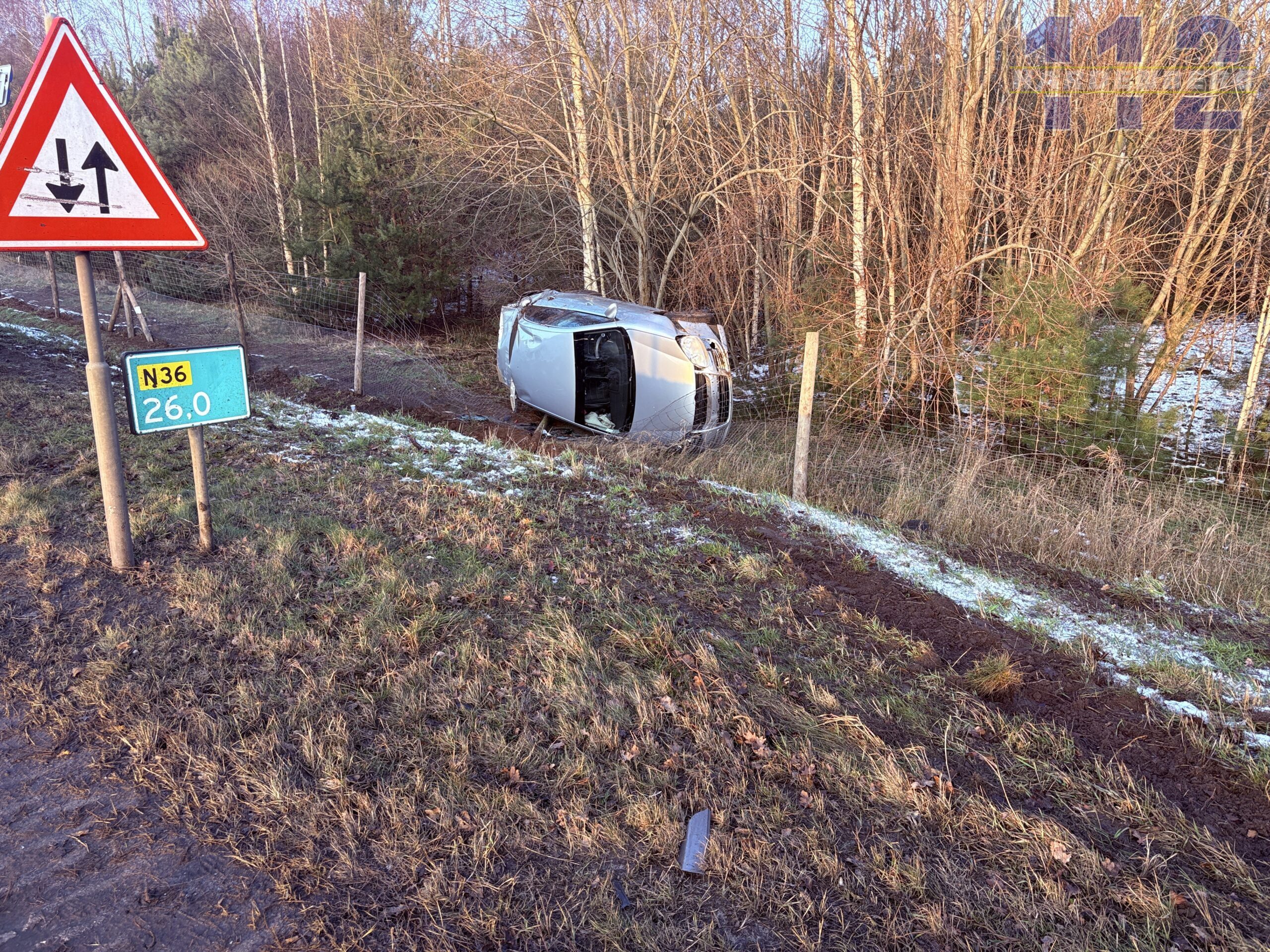 Een personenauto raakte door onbekende oorzaak van de weg en belandde op zijn kant in de berm.