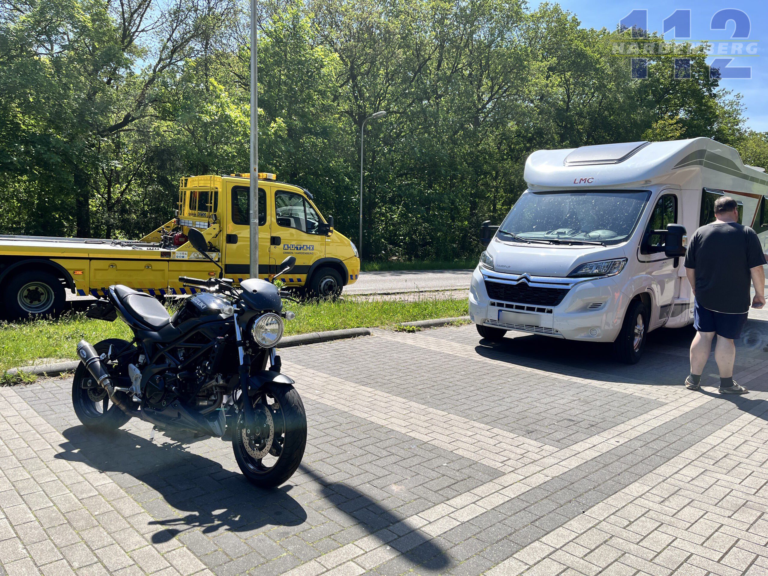 De motorrijder wilde de rotonde oprijden en werd aangereden door de bestuurder van een Duitse camper. Niemand raakte bij de aanrijding gewond.