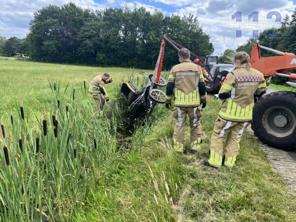 De marathonwagen is eveneens door de brandweer en met behulp van een shovel van omwonenden uit de sloot gehaald.