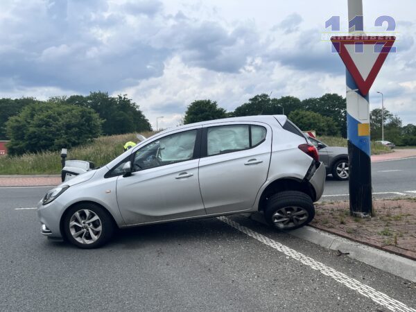 Vrachtwagen en personenauto botsen op rotonde Witte Paal in Rheezerveen