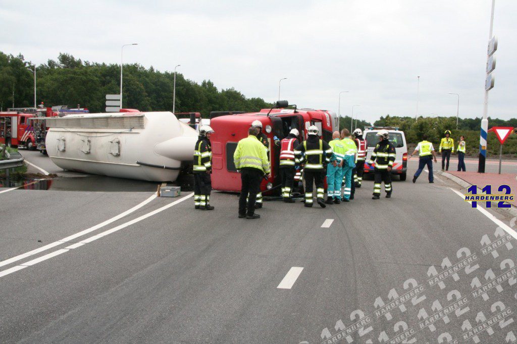 Rheezerveen / N36 bij Hardenberg nog tot vanavond negen uur afgesloten wegens gekantelde tankwagen. Een bulktankwagen gevuld met een vulmiddel voor asfalt in donderdagmorgen op de rotonde Witte Paal omgeslagen. De truck met oplegger , van een transportbedrijf in Rijssen, kwam vanuit de richting Almelo en wilde na de rotonde de N36 vervolgen in de richting van de N48. Waardoor de combinatie kantelde is onbekend. De chauffeur is door het ambulance personeel ter plaatse aan een hoofdwond behandeld. Later is hij toch nog ter controle naar een ziekenhuis vervoerd. Een van de dieseltanks raakte door het ongeval lek en zorgde voor een grote plas op de straat , de brandweer damde dit af waardoor het niet in de putten liep en werd door de brandweer geneutraliseerd. Het verkeer werd ter plaatse omgeleid en volgens Rijkswaterstaat kan de omleiding cq afzetting ter hoogte van de N36 bij de aansluiting met de N34 tot donderdagavond 21.00 uur duren.
